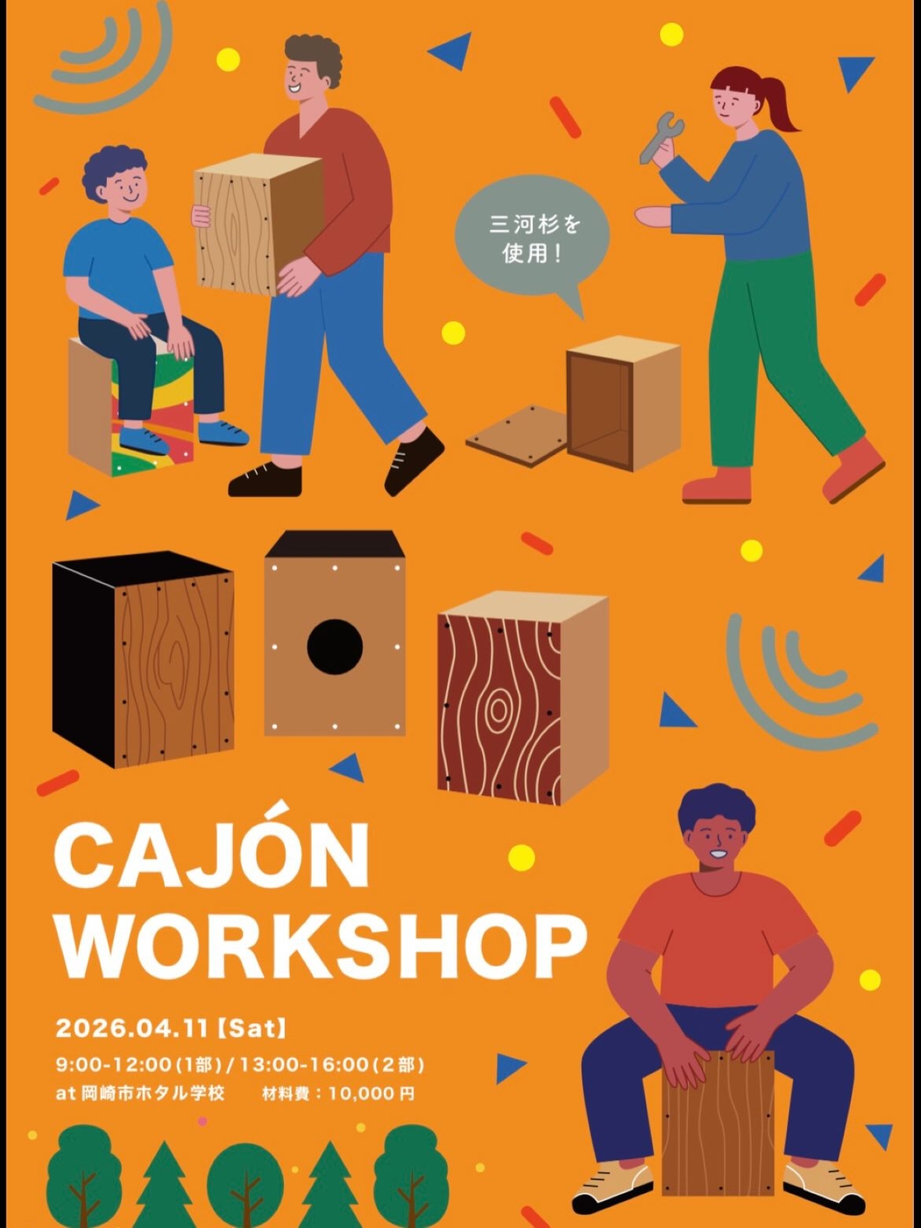 今回は、山﨑正夫さんが以前から取り組まれていた、「地域材に触れてもらう機会をつくり、ものづくりの楽しさを知ってもらう」という活動を背景に、カホンのワークショップを開催します。