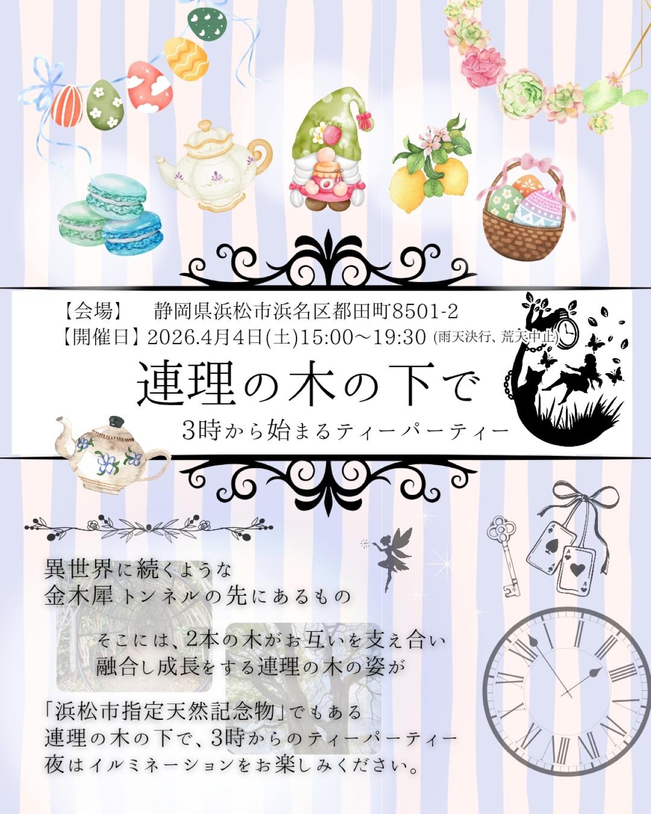 普段、施設利用者のみしか見る事ができない、浜松市指定天然記念物の「連理木」の一般公開日に合わせ、オリジナルアフタヌーンティーを楽しむイベント、3時から始まるのティーパーティを開催致します。