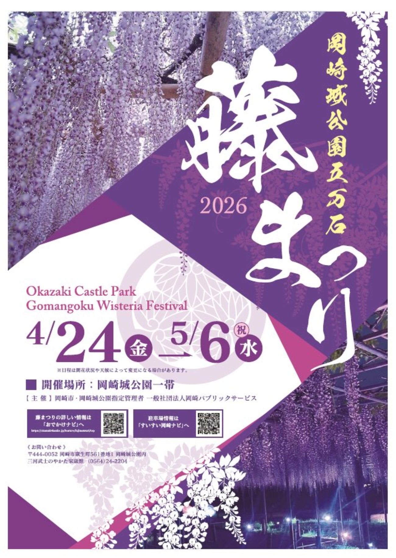 岡崎城公園では、紫色の藤の花が広がっています。