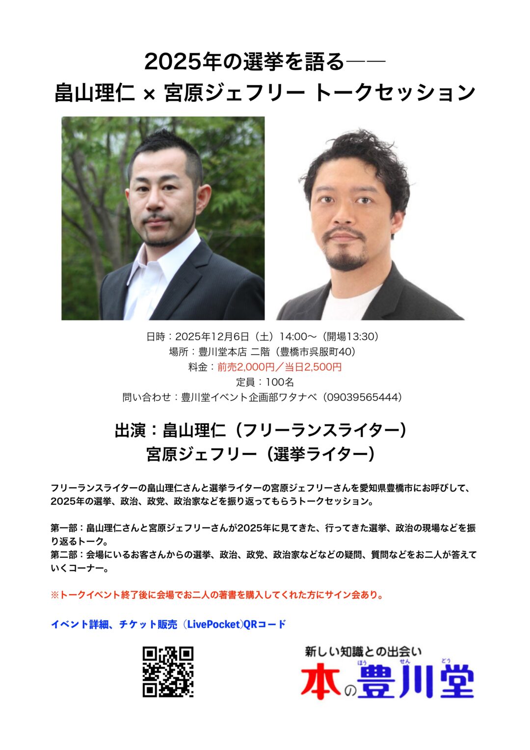 フリーランスライターの畠山理仁さんと選挙ライターの宮原ジェフリーさんを愛知県豊橋市にお呼びして、2025年の日本の選挙、政治、などを振り返ってもらうトークセッション。