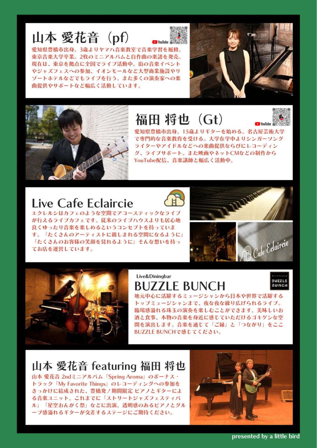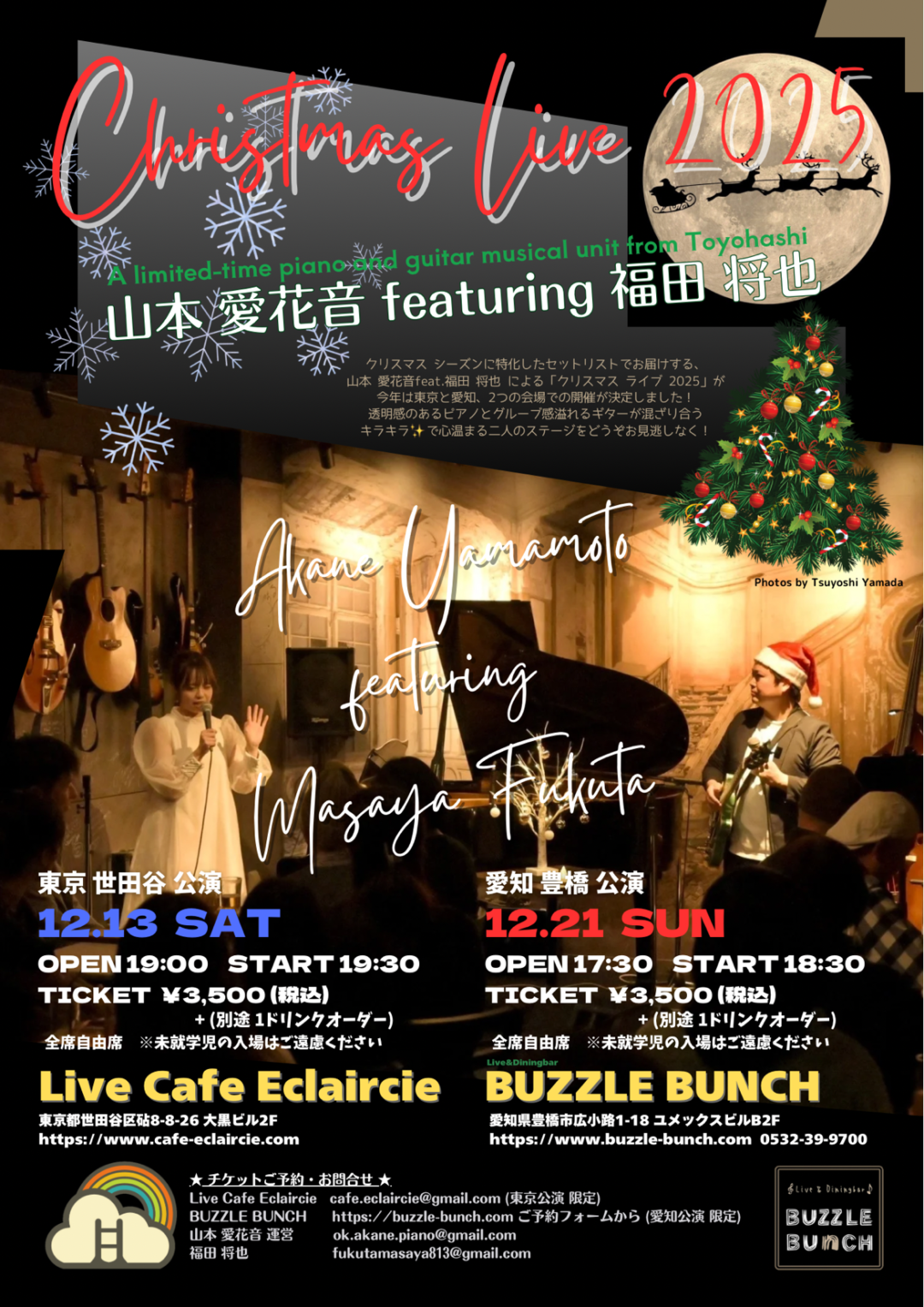 豊橋発!ピアノとギターの音楽ユニット「山本愛花音featuring福田将也」によるクリスマスライブを東京と豊橋の2会場で開催します。クリスマスソングの他、愛花音作曲のオリジナル曲、往年の名曲から昭和歌謡と幅広いジャンルでお届けします。透明感