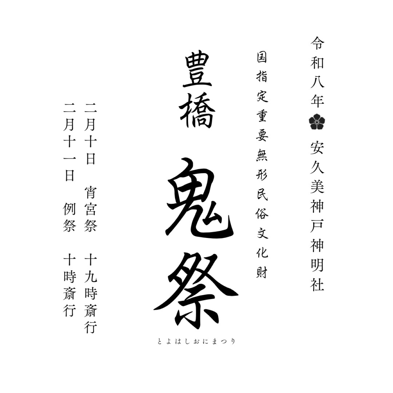 安久美神戸神明社の例祭【豊橋鬼祭】は、東三河に春の訪れを告げる祭礼として、毎年2月10日・11日に亘って行われます。平安から鎌倉時代に流行した田楽に日本建国の神話を取り入れて神事としたもので、古式を崩さずに伝えられていることから国の重要無形民俗文化財として指定されております。