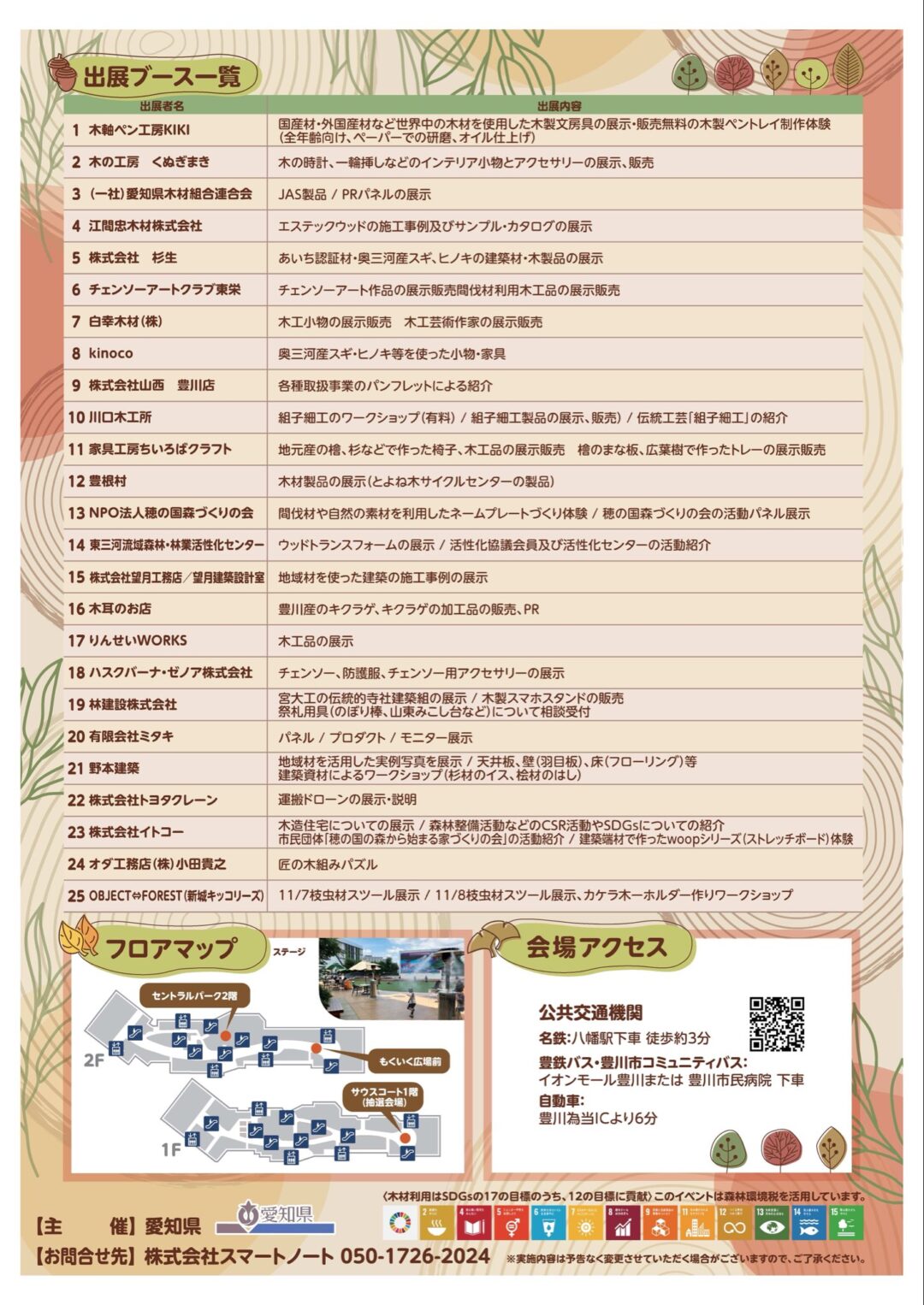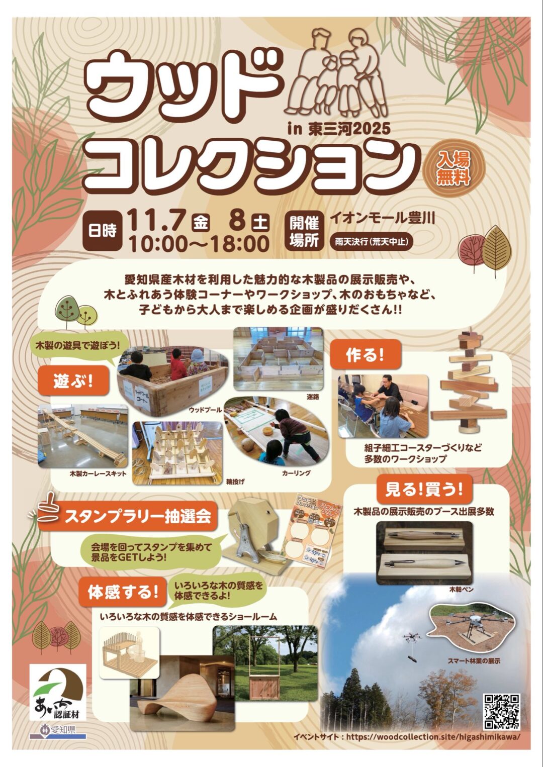 愛知県では、東三河地域を中心とした林業・木材加工・建築等事業者の企業間交流の場と、県民の皆様が木と触れあい、その良さを体感できる機会を創出することにより、愛知県産木材の利用促進及び林業・木材産業の振興を図る、「ウッドコレクションin東三河 2025」を下記のとおり開催します。