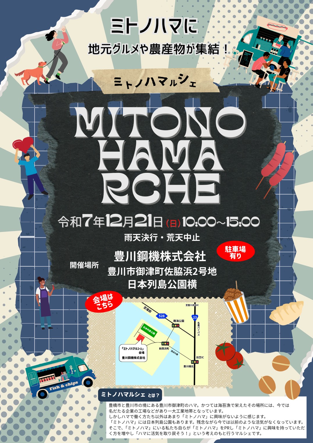現在は一大工業地帯となったこの場所から、再び地域に活気を取り戻したいという想いから「ミトノハマルシェ」を開催します。