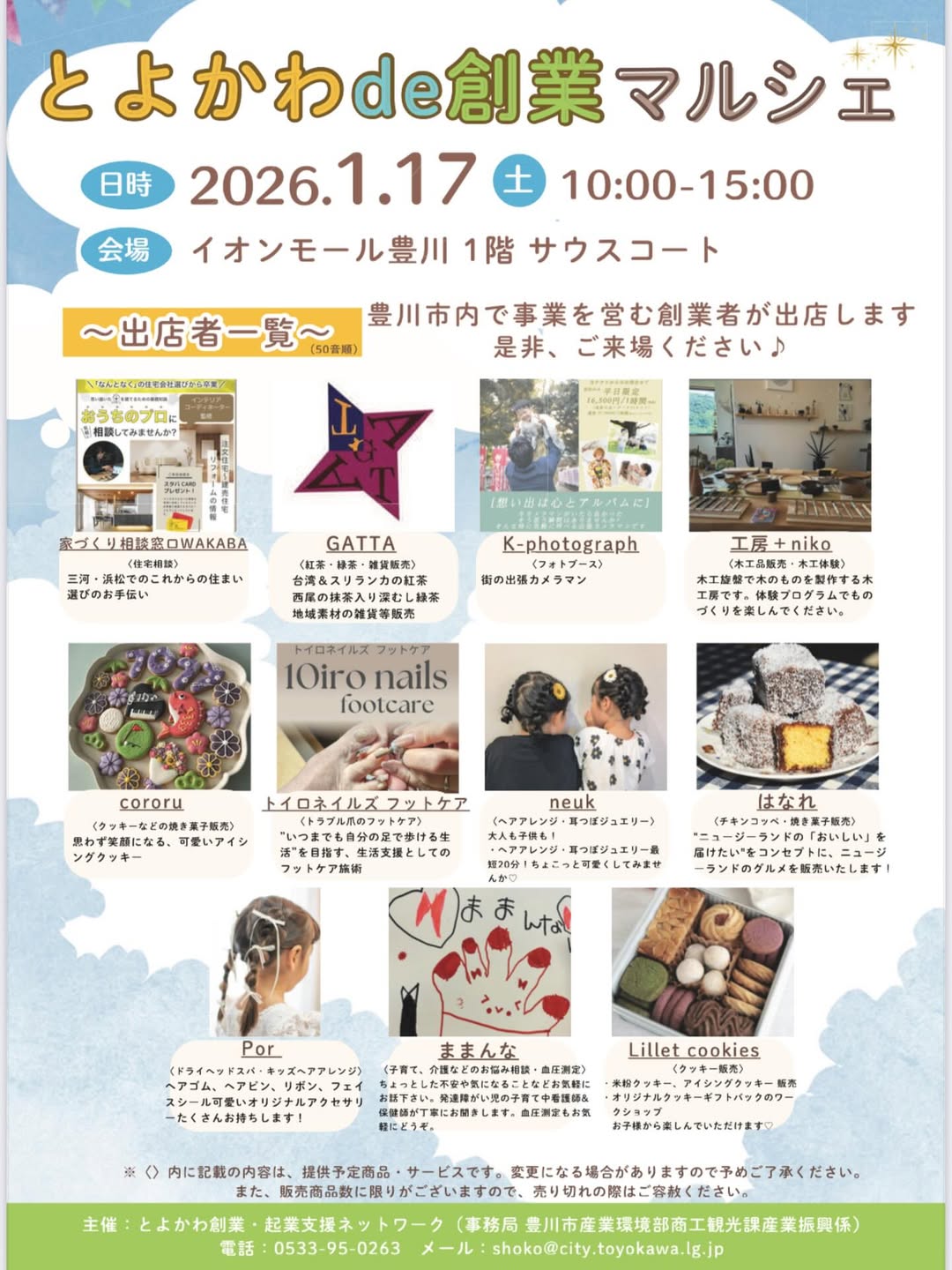 イオンモール豊川において、とよかわ創業・起業支援ネットワークの支援を受けて豊川市内で創業した事業者が出店するマルシェを開催します。是非ご来場ください♪